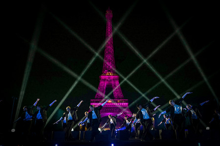 9月30日、乳がんの早期発見・治療を啓発する10月のピンクリボン月間を前に、ライトアップされたパリの観光名所エッフェル塔。月間をPRするイベントが開催され、塔をバックにダンサーたちが踊りを披露した。 【AFP時事】