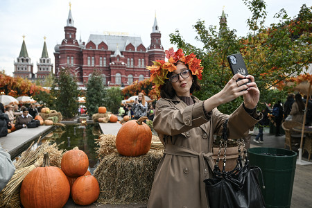 9日、ロシアの首都モスクワにある国立歴史博物館前で、秋の装いで自撮りする女性。博物館は19世紀後半に創立され、軍事パレードなどの国家行事が行われる「赤の広場」に面している。 【AFP時事】