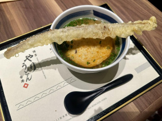 新たに香港オリジナルのメニューも開発した。「豚香味天婦羅烏冬(豚の香味天うどん)」(98香港ドル)は、香港名物のチャーシューポークをアレンジしたメニュー。XO醤(じゃん)と辛味スパイスをだしと合わせた「中華風酸辣湯 海鮮丸子烏冬(酸辣湯うどん)」(98香港ドル)なども期間限定で用意する。