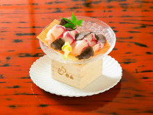富山湾で冬に旬を迎える寒ブリを薄造りにし、トリュフの香りを添えた「寒ブリ簿切刺し身、松露添え」(先付け)は、冷たい海風と炭火を特徴とする冬祭り「寒鰤祭」の夜をイメージした一皿。続く、山形県中山町の「冬芋煮会」から着想を得た「A5肩ロース、甘辛煮」(煮物)は、柔らかな芋とA5和牛の肩肉を甘辛く煮込んで「芋煮」のイメージを表現する。