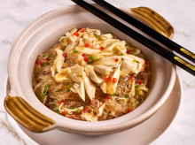 潮州や広東で縁起物とされる海藻「髮菜」とエビのすり身「蝦膠」を巻き上げ、黄金色に揚げた縁起の良い料理で、外は香ばしく、中は海鮮のうまみが広がる「龍鬚金甲發財巻」のほか、潮州料理らしい海鮮のうまみを生かした一品で、新鮮な蟹肉をふんだんに使い、春雨にそのうまみを余すことなく吸い込ませ、胡椒の香りが全体を引き締める土鍋料理「胡椒鮮蟹肉●粉絲●」なども用意した。