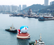 大インフレータブルとなってビクトリアハーバーに浮かぶグリマス(左)とエルモ(右)