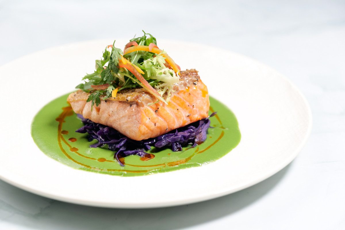 ノルウェー産サーモンを香草と野菜で仕上げた「●三文魚」(208香港ドル)