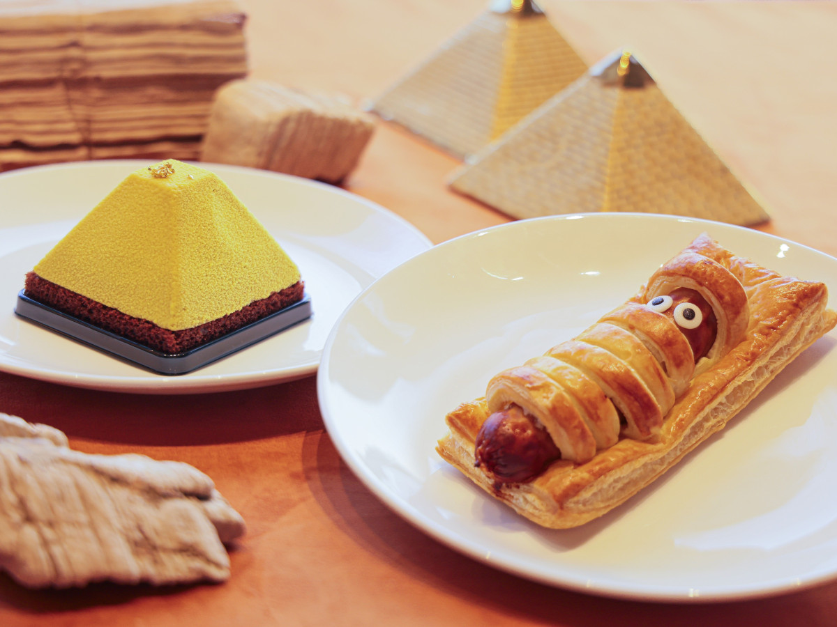 古代エジプトがテーマの「ゴールデンピスタチオピラミッドケーキ」と「ミイラの秘密ロール」(香港・マカオで全店発売)