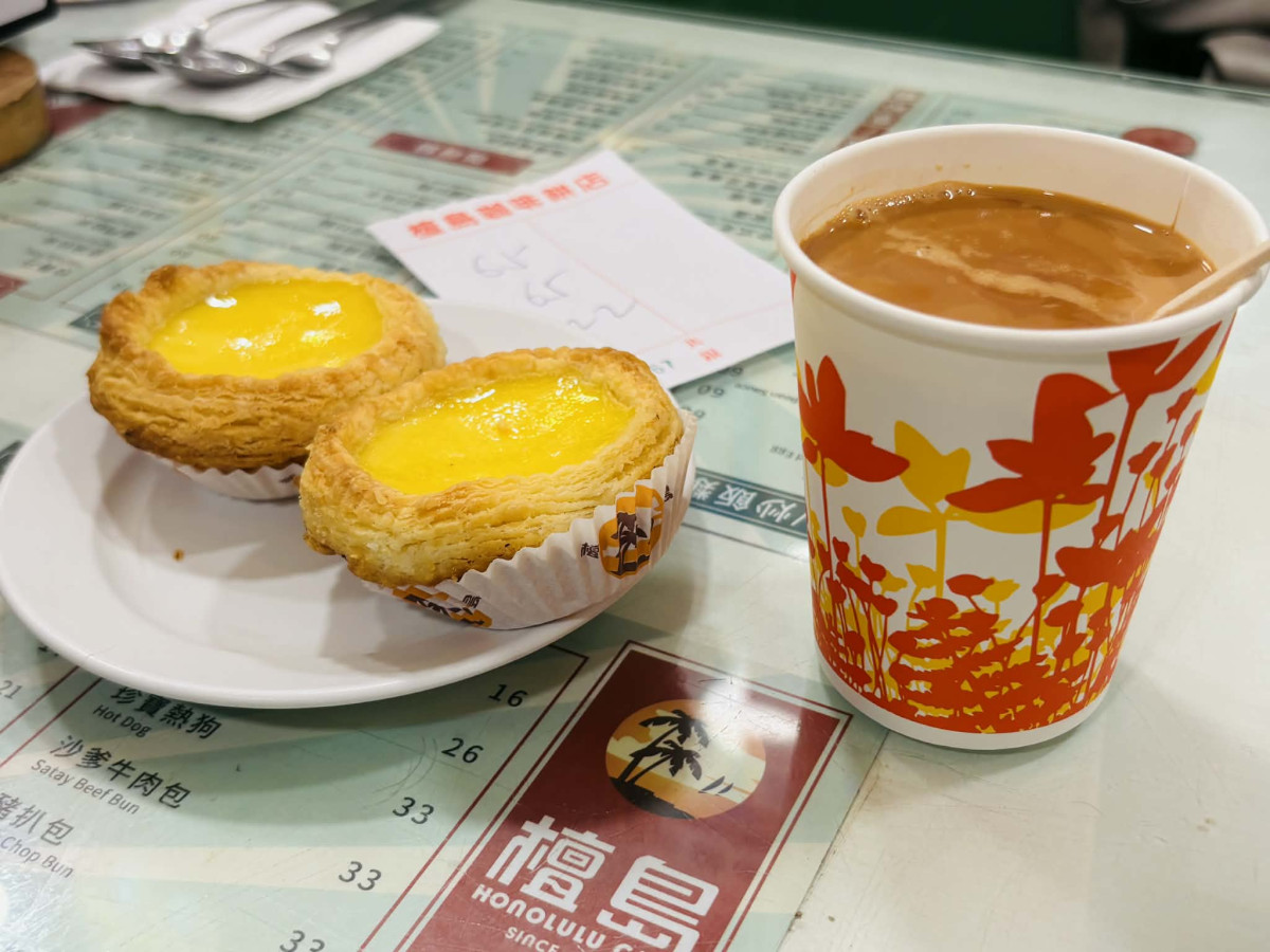 看板メニューのエッグタルトと香港式ミルクティー