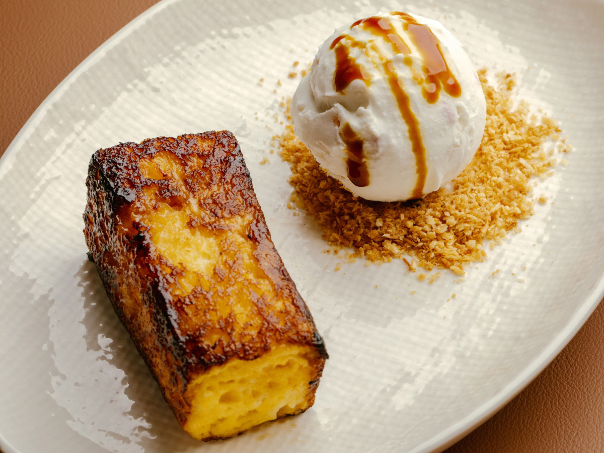 スペイン風フレンチトーストをアレンジしたデザートにアイスを添えて提供する「Coconut Torrija with Chendol Ice Cream」(98香港ドル)